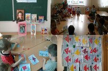 В целях активизации литературной памяти дошкольников, создания эмоционально-положительного настроения, обогащения представления детей о жизни и творчестве А. С. Пушкина, в средней группе проведена беседа, после которой воспитанники закрепили материал сделав аппликацию по сказке о рыбаке и рыбке.
