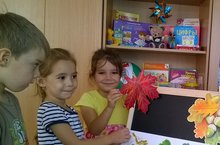 На прогулке с детьми любовались красотой осенних листьев, проводили наблюдение за их полётом. Дети собрали листья различные по форме и окраске и вернувшись в группы, положили их между страницами книг. Таким образом, на следующий день наши листики превратились в гербарий и заняли места в вазах, которые дети сделали самостоятельно в форме больших листиков.