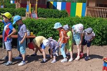 Җәй- табигатьтә иң рәхәт мизгел! Балаларның күп вакыты саф һавада уза. Җәйге искиткеч матур табигатьте күзәтеп, рәхәт җылы һавада бик күп төрле уеннар уйнап була. Бакчабызда рәхәтләнеп уйнар өчен бөтен шартлар да тудырылган. Рәхәт атынгычларда атынып, махсус шугалакларда шуып көнебез бик матур уза. Җәйге рәхәт мизгелләрне бер дә тиз генә уздырып җибәрәсе килми.