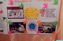 К этому дню мы хорошо подготовились: украсили группу бумажными солнышками с лучиками в виде детских ладошек; воздушными разноцветными шариками; картинками с изображением добрых поступков детей и взрослых. В раздевалке оформили галерею "Мои друзья", где изображены репродукции картин известных художников на тему:"Доброе отношение детей к животным"