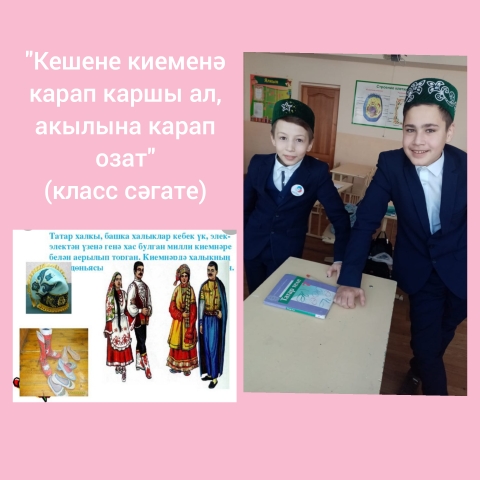 Туган телләр хәм халыклар бердәмлеге елы уңаеннан 7 класс укучылары "Кешене киеменә карап каршы ал, акылына карап озат" исемле класс сәгатендә халкыбызның милли киемнәре белән таныштылар. Осталар чиккән калфаклар, кәләпүшләр, түбәтәйләр, нәфис муенсалар, чигүле алъяпкычлар, бәби итәкле күлмәкләр, камзуллар рәсемнән каралсада искиткеч матурлар иде. Укучылар әлеге класс сәгатеннән бик кәнәгать калдылар. -