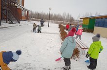 Дети всегда с нетерпением ждут зиму: первый снег, лёд, первые сугробы. Это сказочное время, время разнообразных игр на свежем воздухе. Обычная зимняя прогулка с детьми может превратиться в интересные занятия, ведь снег даёт возможность активно двигаться, творчески развиваться ребёнку. Сегодня дети старшей группы "Лучики" занимались и трудовой деятельностью. Они убирали снег своего участка.
