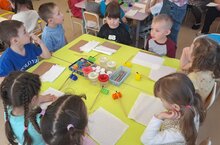 Сегодня воспитанники старшей группы "Капелька" пробовали сделать роспись на ткани. Роспись по ткани оказалась очень интересным и увлекательным для детей занятием, простым в исполнении, и в то же время весьма эффективным по результатам. Дети с интересом работали над красочными композициями, гармонируя сначала немного, а затем всё большее количество цветовых сочетаний. Образную выразительность композиций дополняла фактура ткани, придавая образу мягкость звучания и оригинальность.