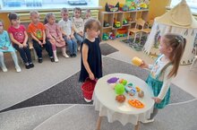 Игра всегда предполагает принятия решения - как поступить, что сказать, как выиграть. Желание решить эти вопросы убыстряет мыслительную деятельность играющих. А если ребёнок будет думать на иностранном языке? Конечно же, здесь таятся богатые обучающие возможности. Дети, однако, над этим не задумываются. Для них игра прежде всего - увлекательное занятие. В игре все равны. Она посильна даже слабым ученикам. Чувство равенства, атмосфера увлечённости и радости, ощущение посильности заданий - всё это даёт возможность ребятам преодолеть стеснительность, мешающую свободно употреблять в речи слова чужого языка и благотворно сказывается на результатах обучения. Незаметно усваивается языковой материал, а вместе с этим возникает чувство удовлетворения - оказывается, я могу говорить наравне со всеми. Сегодня с детьми средней группы пошли в магазин купить продукты.