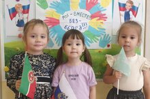 В группах были организованы выставки рисунков «Без бергэ!Мы-вместе!», коллективные работы, прошел познавательный час «Народов дружный хоровод», развлечения «Мы едины-мы живем в России!», а спортивные соревнования «Мы дружны, непобедимы!» показали ловкость и силу ребят, значения сплочения, помощи и дружбы!