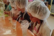 Сегодня воспитанники и воспитатели старшей группы "Сказка" провели весёлые, научные эксперименты/ Группа на время превратилась в научную лабораторию/ Девочки и мальчики в медицинских шапочках и фартуках, как настоящие учёные вооружились специальным оборудованием. У каждого на рабочем месте была тарелочка, стаканчик, трубочка. На первом этапе эксперимента старательно готовили мыльный раствор, а потом силой собственных лёгких превращали его в пену. Дети — не только великие экспериментаторы. В них неистребим дух соревновательности. Поэтому каждый старался надуть самый большой мыльный пузырь или вспенить раствор до такой степени, чтобы он не помещался в стаканчике/ Оказывается, что вода в стакане, накрытая листком бумаги, обладает суперспособностями, а проткнутый карандашом пакет — это как секрет фокусника.