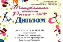 Казан шәһәрендә "Танцевальная юность России-2018" дип исемләнгән бөтенроссия конкурсы булып узды. Бу конкурста катнашып Абдуллазянова Илюза 3 дәрәҗә дипломант исеменә лаек булды. Җитәкчесе Абдуллазянова Г.Г.
