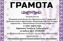 Коллектив МБУ ДО "Новокинерский Дом детского творчества" участвовал во Всероссийскийском конкурсе среди образовательных организаций «Военно-патриотическое воспитание молодежи» по направлению «ВОСПИТАНИЕ УВАЖИТЕЛЬНОГО ОТНОШЕНИЯ К НАЦИОНАЛЬНОМУ ДОСТОИНСТВУ ДРУГИХ НАРОДОВ И ФОРМИРОВАНИЕ КУЛЬТУРЫ МЕЖЛИЧНОСТНЫХ ОТНОШЕНИЙ» И ЗАНЯЛ III МЕСТО.