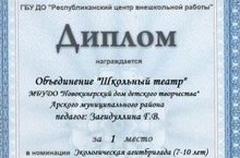 Объединение "Школьный театр" (рук.Загидуллина Г.В.) заняло 1 место в номинации экологическая агитбригада республиканского конкурса юных защитников природы "Сохраним лесную красавицу-2018" в рамках Всероссийской природоохранной акции "Ель-2018".