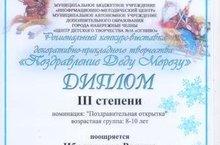 Обучающуюся в кружке "Мастера 21 века" Ибрагимова Р. (рук.Загидуллина Г.В.) заняла 3 место в региональном конкурсе "Поздравление Деду Морозу".