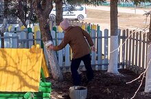 Сегодня побелили деревья. Это не только помогает защитить их от вредителей, но и придаёт им ухоженный вид.