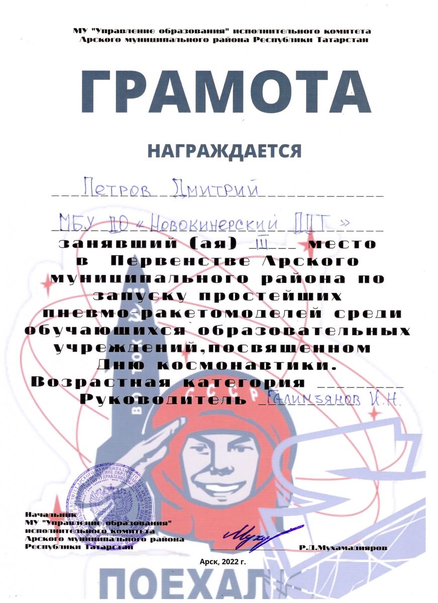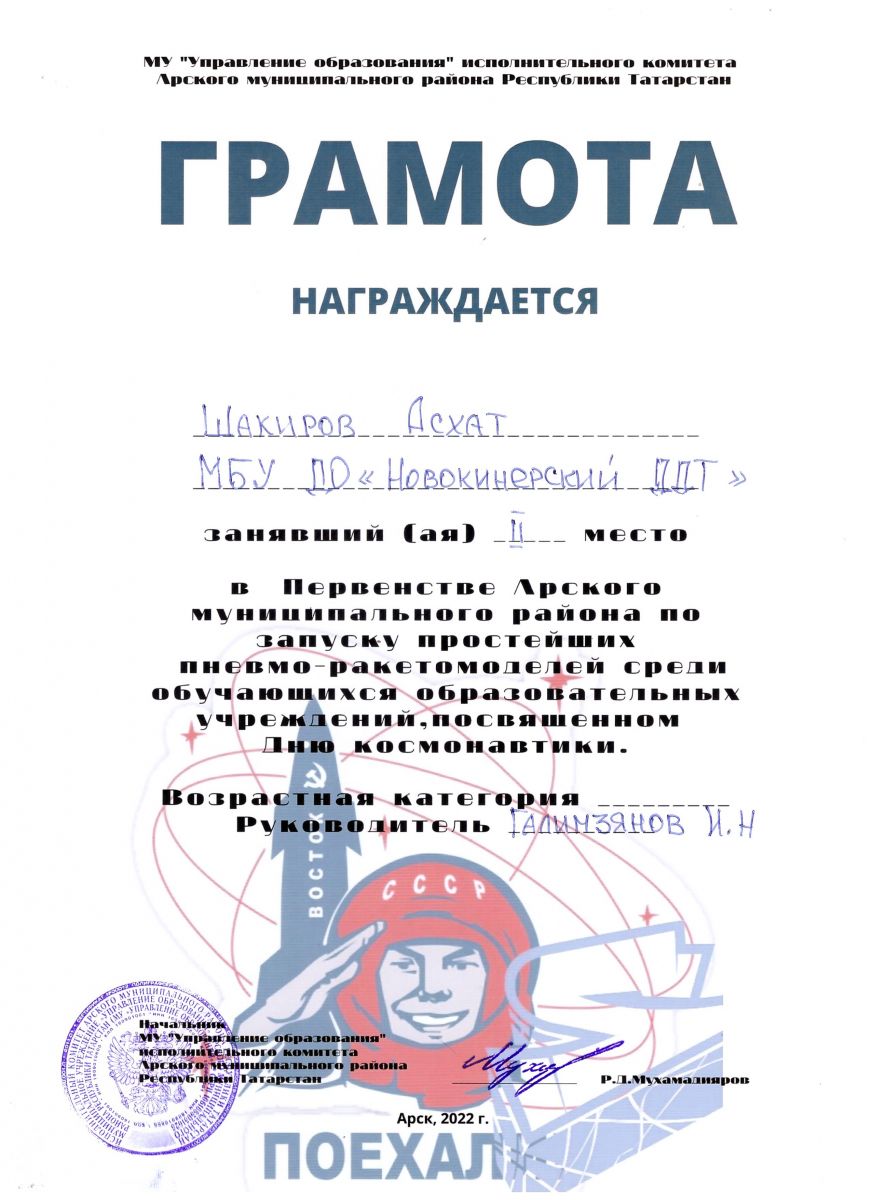 1 место в Первенстве по запуску простейших пневмо-ракетомоделей