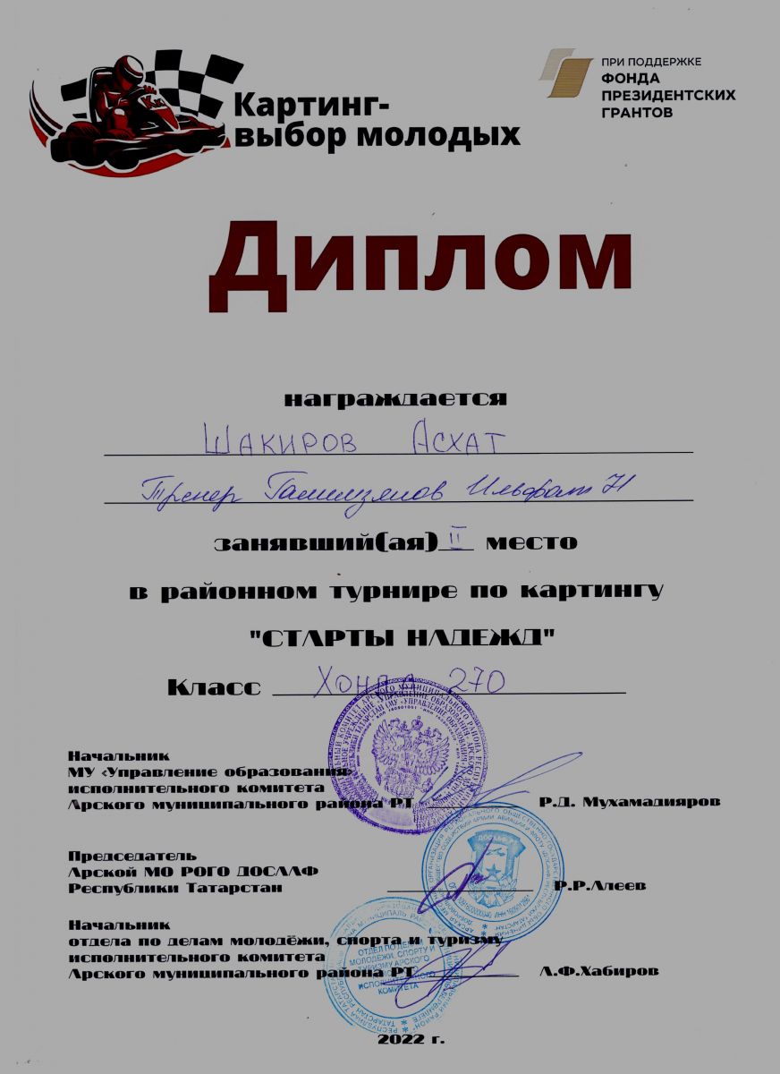 Диплом 1 место - турнир по картингу "Старты надежд"
