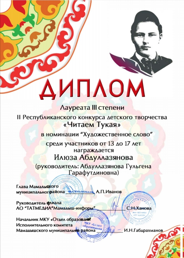 Диплом лауреата 3 степени - "Читаем Тукая"