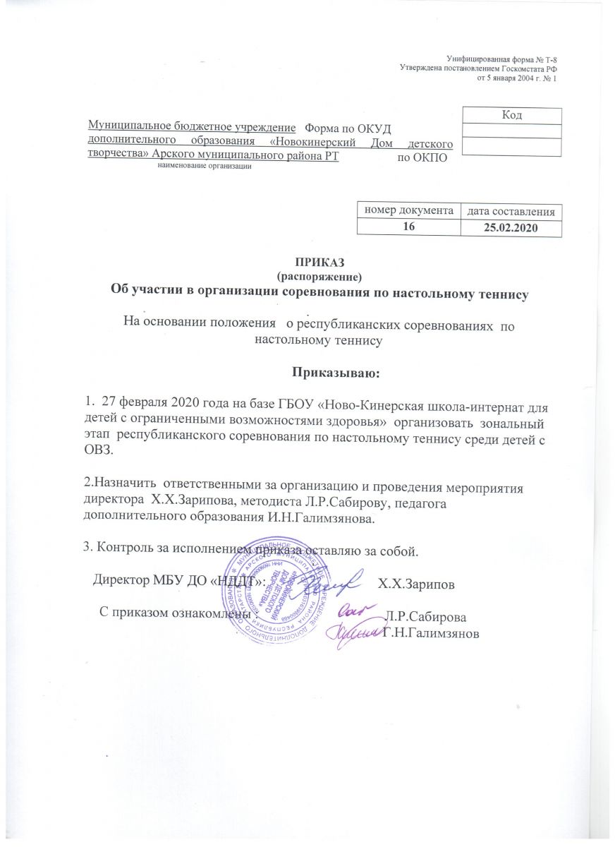 Приказ об участии в организации соревнования по настольному теннису
