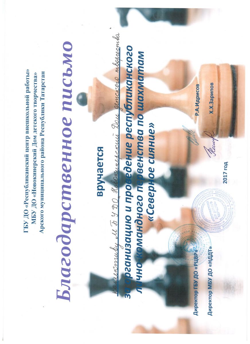 Благодарственное письмо за организацию соревнований по шахматам.