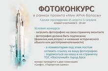 Арский Дворец школьников с 25 марта по 15 апреля проводитфотоконкурс рамках проекта Мин Арча баласы. Условия фотоконкурса: 1. Сделать своё фото на фоне достопримечательности или исторического объекта; 2. Опубликовать на странице в контакте. 3. В комментариях указать ФИО, возраст участника, название достопримечательности или исторического объекта.4. Ссылку на фотографию указать в комментариях объявления о конкурсе https://vk.com/wall-185727872_210