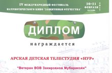 Арская детская телестудия « Нур» стала дипломантом на Международном конкурсе кино « Защитники отечества». Диплом вручили за фильм «Ветеран Великой Отечественной войны Закирзянов Мубаракзян». -