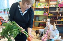 На этой неделе дети младшей группы в ходе познавательных бесед узнали много интересного о моркови: где она растет,как надо за ней ухаживать , чем она полезна ,кто ее любит есть,что морковку нужно употреблять в разнообразных вариантах- целую, тёртую,сырую и варёную.Что из неё можно приготовить разные блюда.