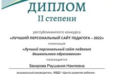 Поздравляем нашего музыкального руководителя, Закирову Раушанию Наилевну с победой в конкурсе "Лучший персональный сайт педагога - 2022". Она получила диплом ll степени в номинации "Лучший персональный сайт педагога дошкольного образования". Пусть эта победа станет одной из многих, которые еще ждут Вас впереди!