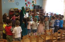 Бүген зурлар төркемендә тәрбияләнүче балалар беренче һәм икенче уртанчы төркем балаларында кунакта булдылар. Әлбәттә,кунакка барганда кучтәнәчсез бармыйлар, балалар күчтәнәч итеп А.Алишның “Куян кызы”әкиятен уйнап күрсәттеләр. Куян-Ландыш, Куян кызы- Газизә, Тиен-Сөмбел, Ранил-Доктор Айболит үзләренең рольләрен бик оста башкардылар. Уртанчыларга артистларның әкиятне сәхнәләштерүләре бик ошады. Алар зурларның килүләрен тагын көтеп калдылар.