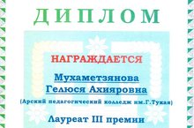 Студентка 3 курса группы «В» Мухаметзянова Гулюса стала лауреатом III степени премии Арского муниципального района РТ имени Гарифа Ахунова в области литературы, культуры и искусства за успехи и достижения в области поэзии.
