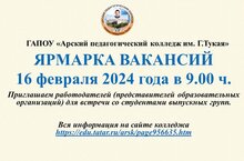 В целях оказания содействия в трудоустройстве выпускников, информирования о вакансиях и работодателях 16 февраля 2024 года на базе ГАПОУ «Арский педагогический колледж им. Г.Тукая» состоится ЯРМАРКА ВАКАНСИЙ.