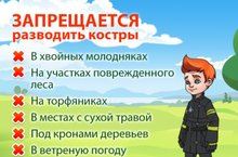 Костер разводить можно только в специально оборудованных местах: вдали от сухих листьев, веток, корней деревьев и молодняка, в месте, очищенном от горючих материалов в радиусе 1,5 м. Если костер больше не нужен, его нужно затушить: тщательно засыпать землёй и залить водой до полного прекращения тления. В сухую и ветреную погоду разведение костров не допускается!