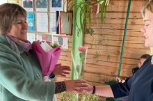 С утра в школе прошла Торжественная линейка для учителей. Учителей встречали с цветами и шоколадками с пожеланиями. -