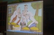 Ноутбок һәм проектор ярдәмендә татарча мультфилмнар һәм әкиятләр карыйбыз.