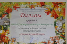 Нашему детскому саду был вручен диплом МУ "Управление образования" исполнительного комитета Арского муниципального района Республики Татарстан за участие в районном конкурсе детского творчества "Осенний калейдоскоп".