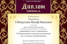 VII Всероссийская олимпиада «Рыжий Котёнок».Ученик 3-го класса Старомасринской НОШ Габидуллин Инсаф, куратор Калимуллина Клара, участвовал во Всероссийской дистанционной олимпиаде по математике для 1-4 классов «Рыжий Котёнок» и занял 1-е место. Награждён дипломом победителя.