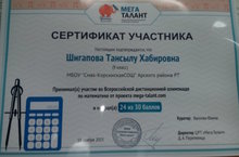 Ученицы 9 класса, Шигапова Тансылу и Хурматова Адиля , куратор Фаима Фаимовна , приняли активное участие во Всероссийской дистанционной олимпиаде по матемитики. Хурматова Адиля получила диплом призера, а Шигапова Тансылу сертификат участника. Поздравляем ниших учениц , желаем им дальнейших побед!