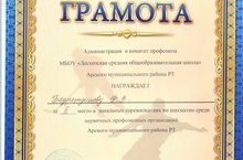 2001-2002 елгы укучылар арасында Татарстан беренчелегенең чаңгы буенча зона ярышлары Саба районында үткәрелде. Әлеге ярышта мәктәбебезнең Сайфуллина Динә, Фазлиева Илүзә, Хәбиева Ландыш, Ахметзянов Динар, Шакиров Илназ һәм Ситдиков Эльвирлардан торган команда мактаулы дүртенче урынны яуладылар. Сайфуллина Динә шәхси беренчелектә үз яшьтәшләре арасында беренче урынны алды. Команданы әлеге ярышка әзерләгән физик тәрбия укытучысы Ситдиков А.Г.ка зур рәхмәтебезне белдерәбез!