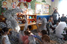 Детсад яны территориясен бизәдек: урамдагы чыршыларга шарлар, мишуралар элдек, плакатлар ябыштырдык, Кыш бабай, Кар кызлары ясадык. Яңа елны каршыларга әзерләнеп, детсад эченә дә елка куеп, аны бизәдек.