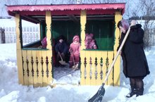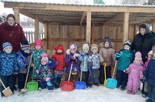Көн матур булса, без балаларны һәр көн урамга алып чыгабыз. Урамда алар уен мәйданчыгында уйныйлар, чана шуалар,кыш бабай ясыйлар. Саф һавада хезмәт тәрбиясе аеруча файдалы. Һәр баланың кыш көне кар көрәргә үз көрәге, көз көне яфрак тырмаларга тырмасы, кечкенә носилкалар бар. Теләге булган һәр бала кулына алып эшли ала.