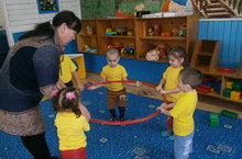 На занятиях физкультуры мы научились играть с обручем, соблюдать дистанцию,слушать команды воспитателя.