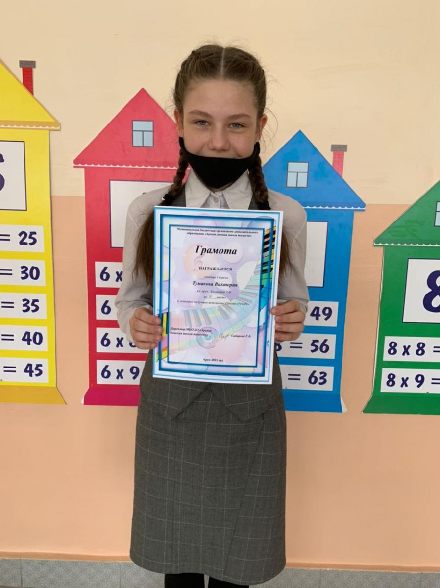 Ученица 4 класса Тумакова В. заняла 3 место в конкурсе на лучшее исполнение ганона "Ручеек", который проходил в Арской школе искусств. 4 сыйныф укучысы Тумакова В. Арча сәнгать мәктәбендә узган "Ручеек" ганонын иң яхшы башкару бәйгесендә 3 урынны яулады.