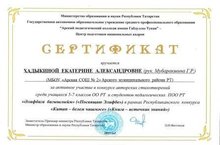 Республиканский конкурс “Китап- Белем чишмәсе” 12.09.2015 Хадыкина Екатерина Александровна – ученица 8 А класса ( руководитель – Г.Р.Мубаракшина ,учитель татарского языка ) награждена сертификатом за активное участие в конкурсе авторских стихотворений среди учащихся 5-7 классов ООО РТ и студентов педагогических ПОО РТ “Әлифбага багышлыйм”(“Посвящаю Элифбе”) в рамках Республиканского конкурса “Китап- Белем чишмәсе”.