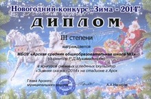 На открытии районной елки 26 декабря 2013 года школы и предприятия г. Арск участвовали в творческом конкурсе "Новогодний гороскоп". Команда нашей школы удостоена Диплома III степени.