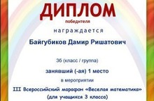Стали известны результаты III Всероссийского марафона "Веселая математика". Ученик 3 б класса Байгубиков Дамир (учитель Халиуллина Оксана Анатольевна) занял I место. Поздравляем с победой!