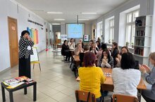 У нас учат: 46 педагогов; язык обучения: русский