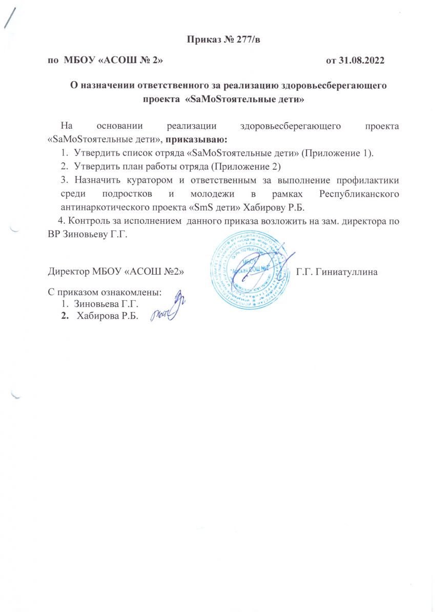 Приказ о назначении ответсвтенного за реализацию здоровьесберегающего проекта "SаMоSтоятельные дети"