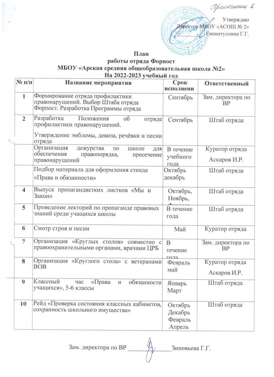 План работы отряда Форпост МБОУ «Арская СОШ №2» на 2021 – 2022 учебный год