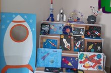 "Җир һәм космос" 12.04.2021 12 апрель - Космонавтика һәм авиация көне.Шул уңайдан балалар бакчасында "Җир һәм космос" темасына рәсемнәр һәм кул эшләре күргәзмәсе оештырылды.