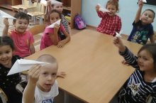 С целью: способствовать накоплению у детей конкретных представлений о самолетах,уточнить и закрепить умение складывать бумажный лист вдвое, по диагонали, с ребятами средней группы воспитатели провели занятие по конструированию из бумаги в технике оригами "Самолетик".
