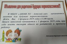 МБОУ «Арская НОШ №3-детский сад» с 1 февраля 2019 года начинает прием заявлений будущих первоклассников. При себе иметь оригинал документа, удостоверяющего личность родителя (законного представителя); оригинал и копия свидетельства о рождении ребенка, оригинал и копия свидетельства о регистрации ребенка по месту жительства.