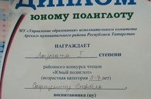 "Юный полиглот" 24.04.2018 Сегодня в детском саду "Центр развития ребенка - детский сад № 4 " прошел районный конкурс " Юный полиглот ". Конкурс проводиться с целью повышения качества обучения детей дошкольного возраста государственным языкам Республики Татарстан ,в том числе английскому языку .Воспитанница нашего детского сада Сафиуллина Сюмбель приняла участие в конкурсе и стала Лауреатом I степени.Поздравляем!