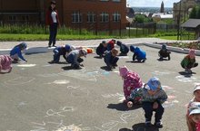 Бүген балалар асфальтта рәсемнәр ясадылар. Төсле акбурлар ярдәмендә ясаган рәсемнәр бик матур булды.