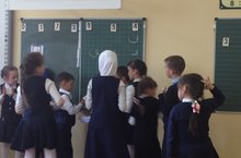 Класстан тыш эшчәнлек буенча ачык дәресләр дәвам итә.Бүген 1 в сыйныф укучылары белән берлектә Гильфанова Л.К. гарәп теленнән ачык дәрес уздырды. Дәрес бик бай эчтәлекле, файдалы итеп үткәрелде.Дәрестә укучылар бик актив катнашты.